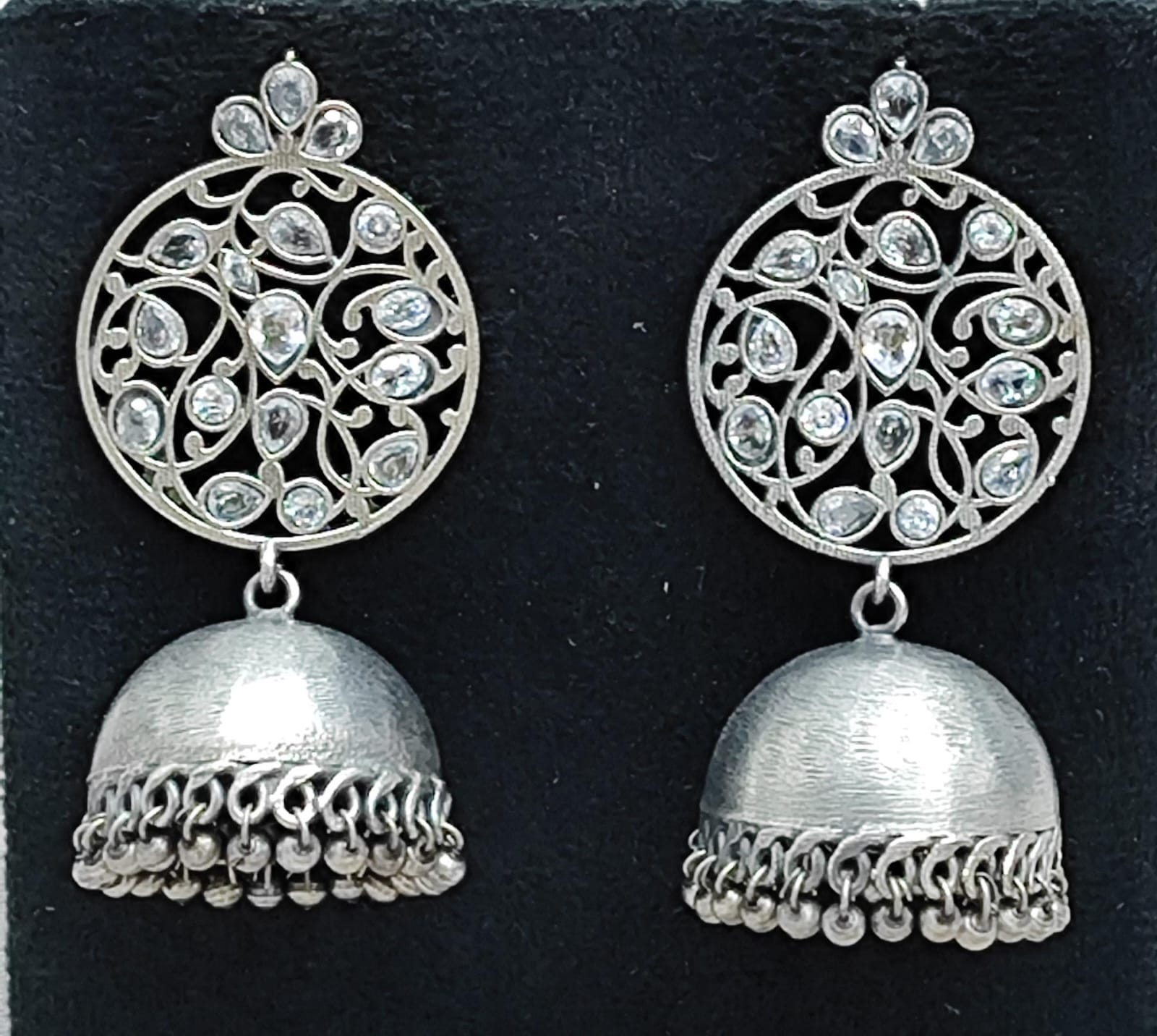 Oxidized Silver Round Jhumka Earrings with White Stone Floral Design